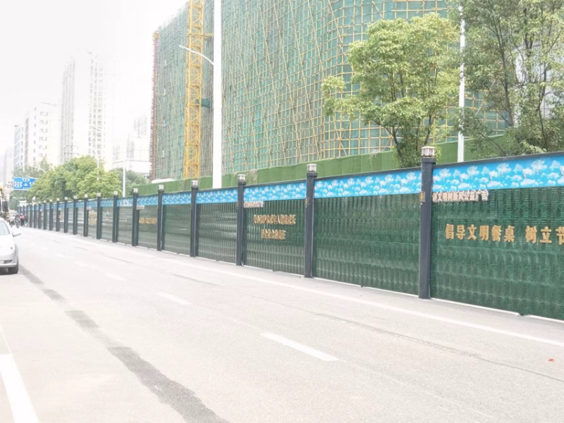3.金属围挡面板由4块,宽500mm*长5820mm*壁厚40mm*板厚0.8mm绿色竹叶彩涂百叶孔吸音隔音金属屏无缝拼接而成,百叶孔面板抗风减震,上部为1块500mm宽蓝天白云配仙鹤亮光眉头,自带亮化灯带,体现武汉文化特色。